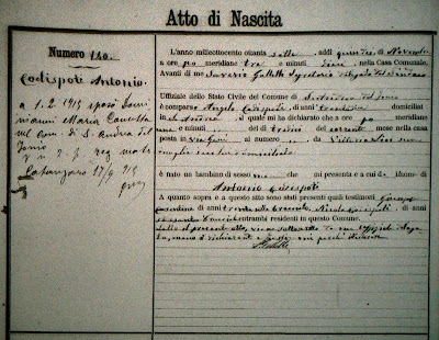 I ordered one roll of film with records dating back to 1865 about three months ago. When it came in recently, I zoomed to the local Family History Center. In less than 15 minutes, after getting to know how exactly the certificates are organized, I hit paydirt. Below are the birth certificates of three of my great grandparents — Bruno Coccari and Elvira Sama — my father’s paternal grandparents, and Antonio Codispoti, his maternal grandfather.